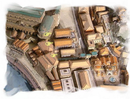 Tra i due si alzava un edificio insolito, una porta trionfale sormontata da un piccolo tempio. Era a questo posto, di fianco al foro olitorio, che si alzava il famoso Elephas herbarius,