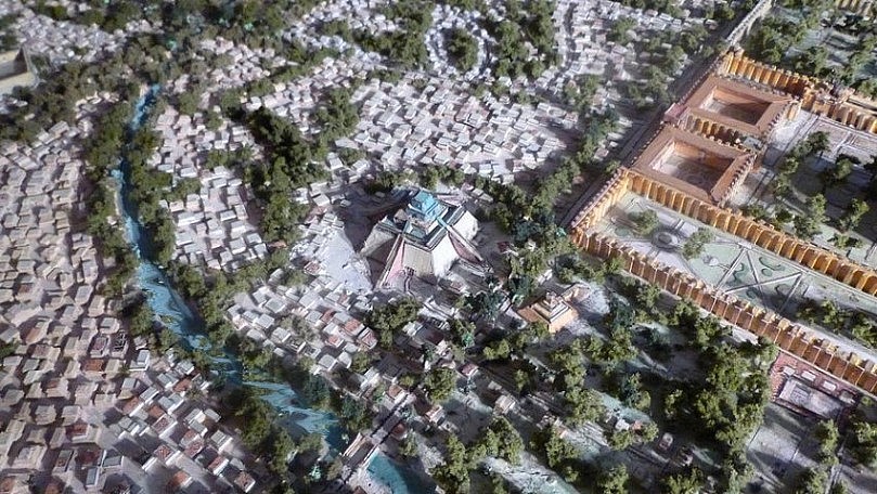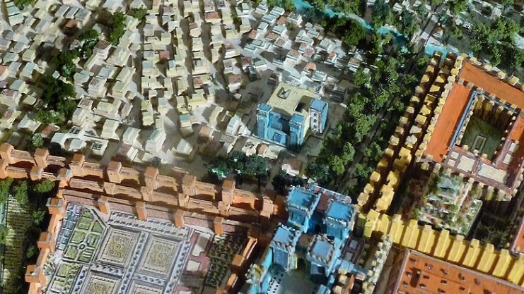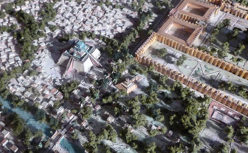 der die Stadt durchquert und im Hintergrund die heilige Einschließung.