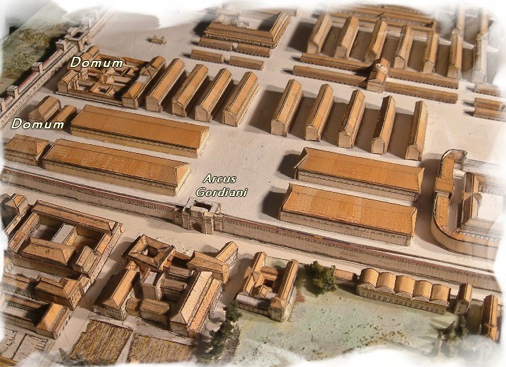 ornée d'un arc de triomphe élevé par Gordien III ( L'Arc de Gordien) (Arcus Gordiani). Des maisons plus spacieuses ( domum ) servaient d'habitation pour les officiers.