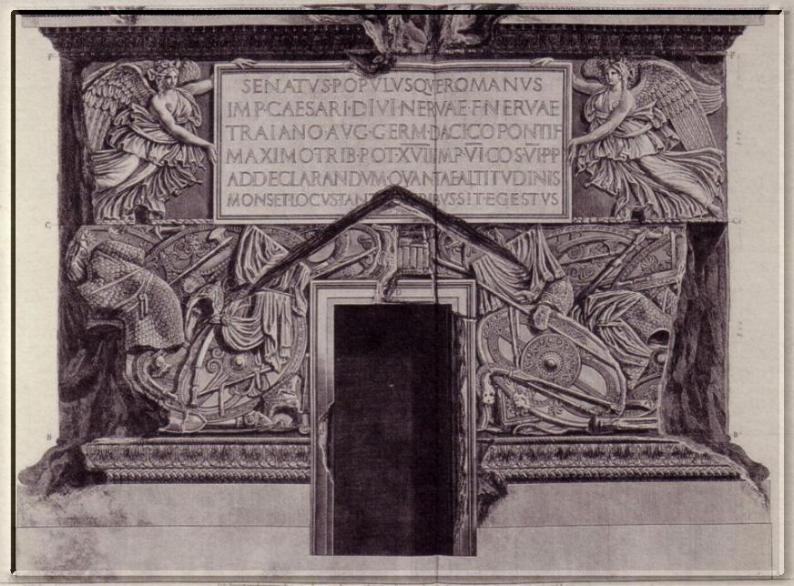 Ici Piranesi présente le piédestal de la colonne Trajane montrant la porte d'entrée ainsi que les inscriptions au dessus du fronton.