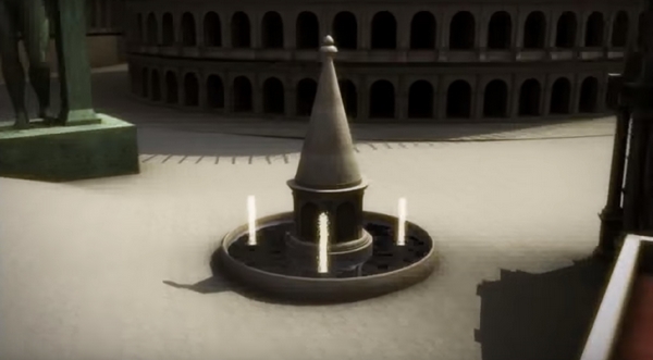 où l'eau jaillissait dans un jeu vertical. Cette fontaine existait déjà sous Néron et fut reconstruite